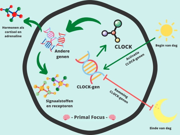 Circadiane ritmes worden bepaald door een hoofdklok, een groep neuronen die de suprachiasmaticus kern die zich in een hersengebied bevindt dat de hypothalamus wordt genoemd. Deze hoofdklok vertaalt signalen uit de omgeving naar richtlijnen voor het lichaam. Receptoren in de ogen detecteren bijvoorbeeld duisternis en geven dat signaal door aan de suprachiasmatische kern, die vervolgens de productie van melatonine stimuleert, het hormoon dat slaperigheid veroorzaakt.